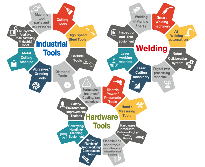 All Kinds of tools, Weldings, machine tools and equipment on display.